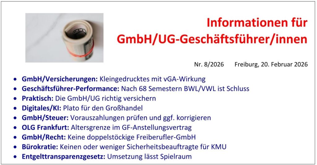 Sehr geehrte Geschäftsführer-Kollegin, sehr geehrter Kollege, unterdessen sind die Versicherungsbescheide für das aktuelle Geschäftsjahr draußen. Meist mit einem gewissen „Anpassungseffekt”. Für die Geschäftsführung Grund, die Policen zu prüfen, ggf. anzupassen oder sogar zu kündigen. Unsere Themen heute: GmbH/Versicherungen: Kleingedrucktes mit vGA-Wirkung: Fehler beim Abschluss der Betriebsunterbrechungsversicherung können teuer werden. Besonders dann, wenn das Finanzamt auch noch…