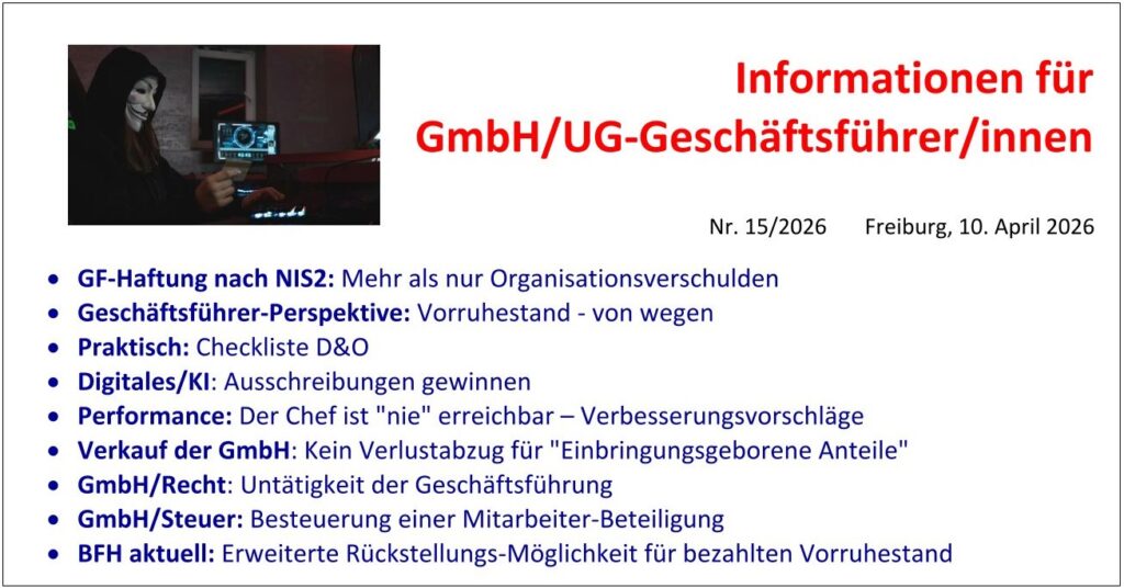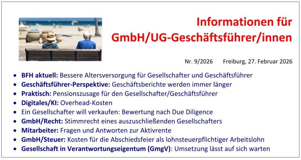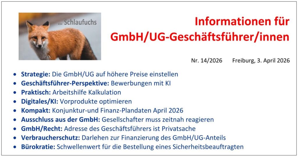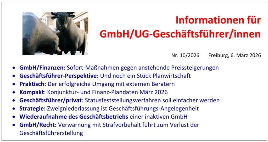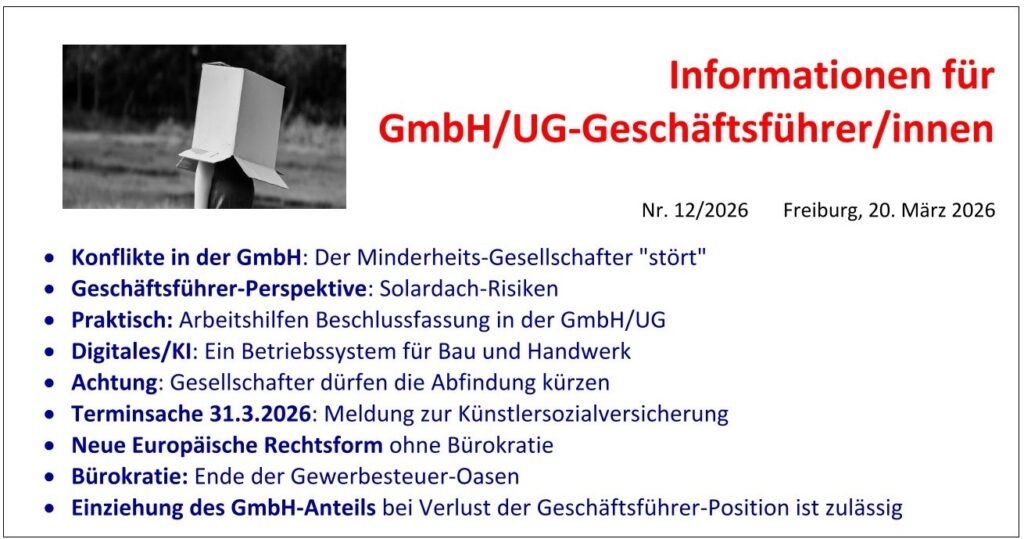 Sehr geehrte Geschäftsführer-Kollegin, sehr geehrter Kollege, und schon wieder rasen die Wochen. Für die vorausschauende Geschäftsführung höchste Zeit, die Weichen der GmbH/UG für 2026 zu stellen. Z. B. den „Gegenstand der GmbH/UG” für neue Geschäftsmodelle erweitern oder die UG in eine Voll-GmbH umwandeln, und und und. Unsere Themen heute: Planung 2026 –…