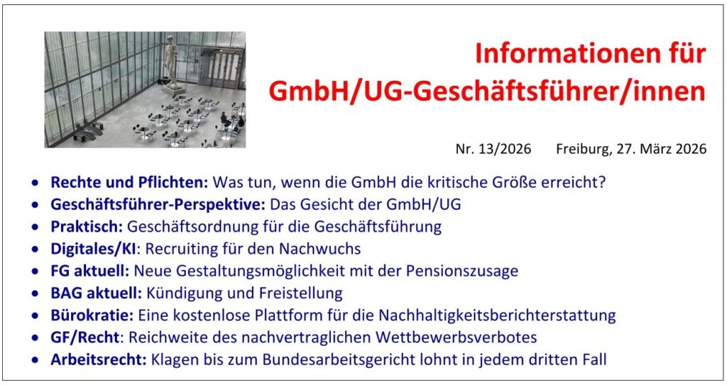 Sehr geehrte Geschäftsführer-Kollegin, sehr geehrter Kollege, wer von den Experten des Weltwirtschaftsforums Lösungen für Wachstum, Beschäftigung und Nachhaltigkeit erwartet hat, muss erst einmal weiter mit der Realität leben. Im Klartext: Die Herausforderungen bleiben. Auch für uns und auch heute wieder mit einigen überraschenden Themen. Unsere Themen heute: GF-Know-How – Die wichtigsten GmbH/UG-Urteile aus 2025 (II):…