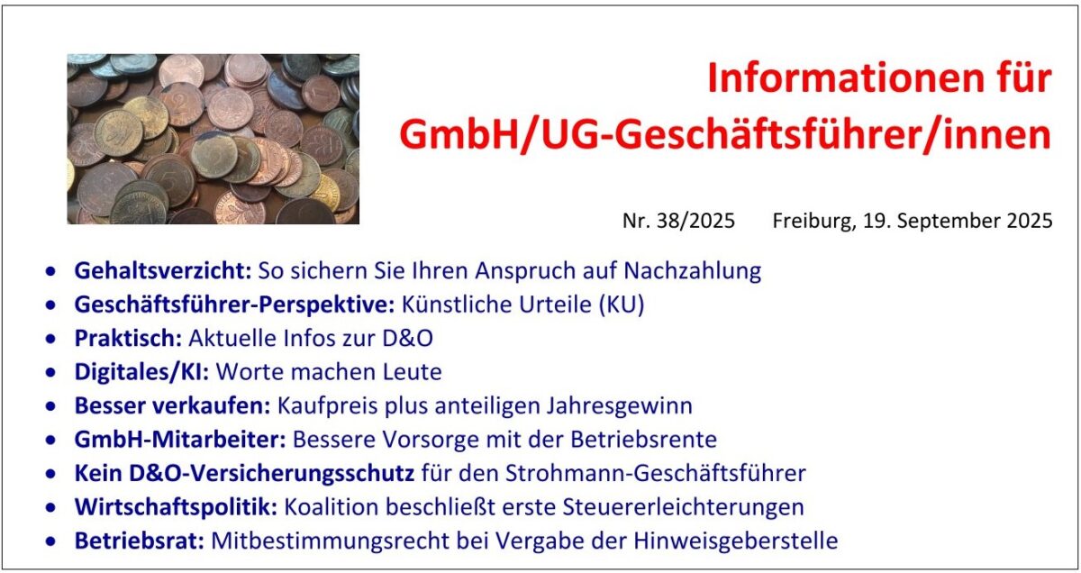 laut Destatis ist die Zahl der beantragten Regelinsolvenzen in Deutschland im August um 19,2 % gegenüber dem Vorjahresmonat gestiegen. Das ist „Rekord”. Auch viele GmbH/UG sind bedroht. U. U. hilft ein Gehaltsverzicht der Geschäftsführung. Unsere Themen heute: