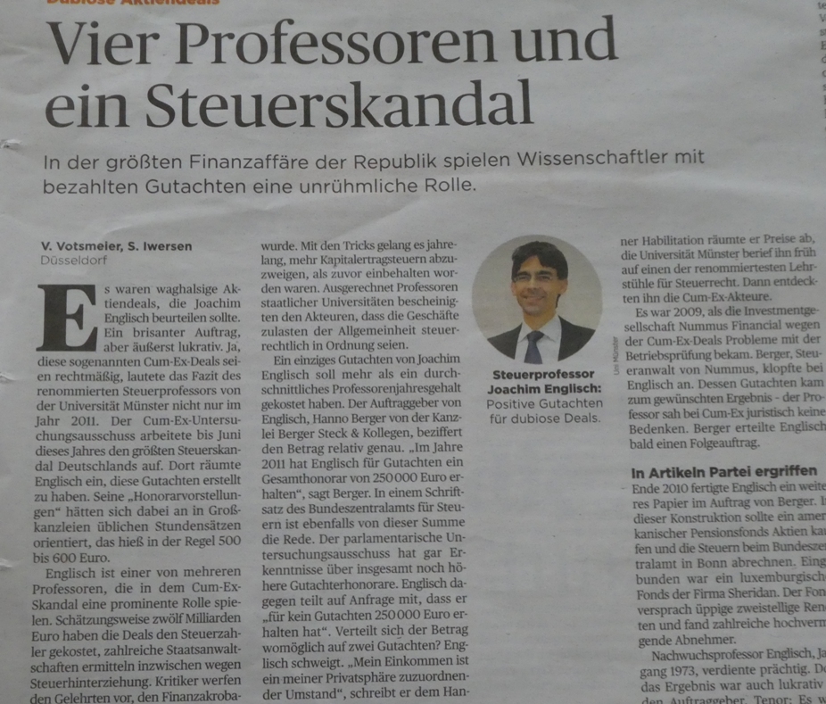 Interessant: Das Handelsblatt (> Hier anklicken) hat die Rolle der in diesem Zusammenhang gutachterlich tätigen Jura-Professoren unter die Lupe genommen. Federführend für ein (Gefälligkeits-) Gutachten ist danach Prof. Joachim Englisch, Steuer-Rechtler an der Uni Münster.